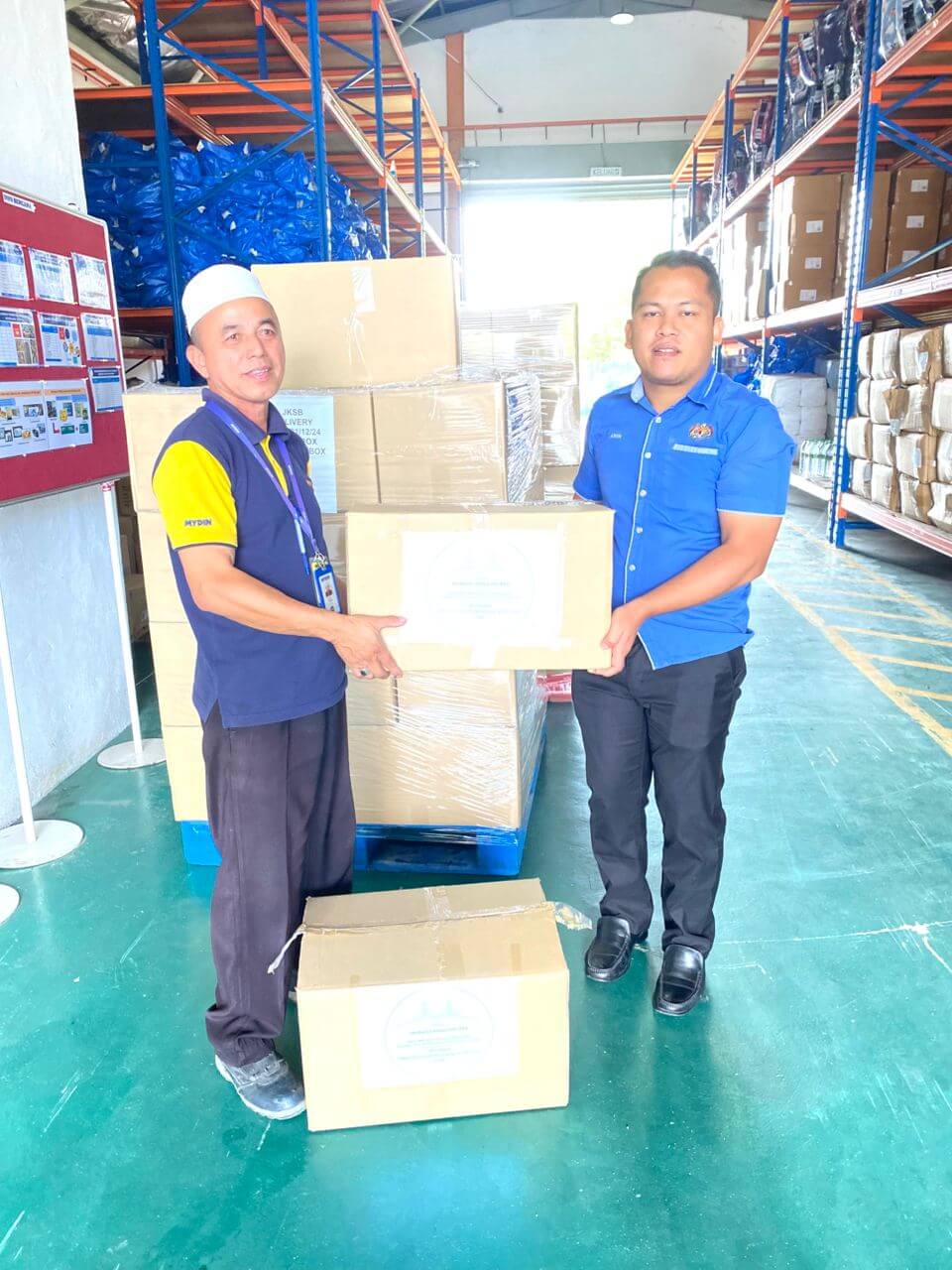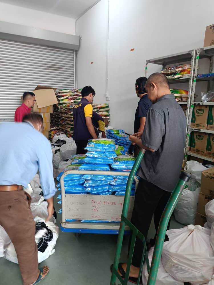 Sebanyak 300 bungkusan kotak mengandungi barangan keperluan asas seperti beras, minyak masak, gula, garam,
