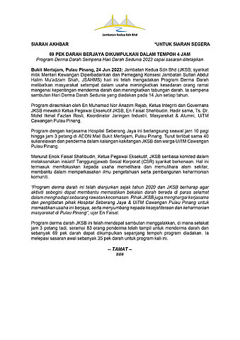 69 PEK DARAH BERJAYA DIKUMPULKAN DALAM TEMPOH 4 JAM