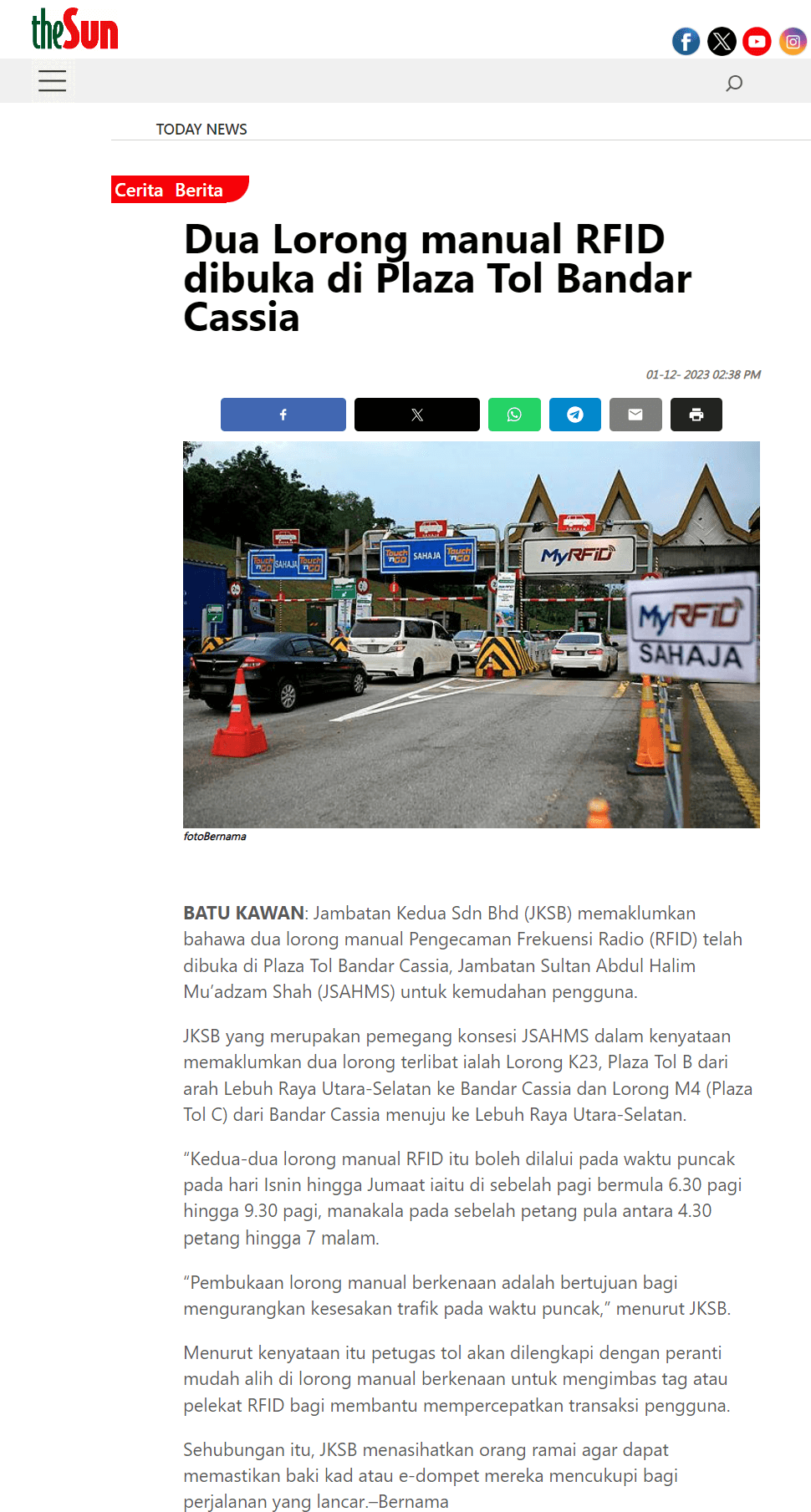 Dua lorong manual RFID dibuka di Plaza Tol Bandar Cassia