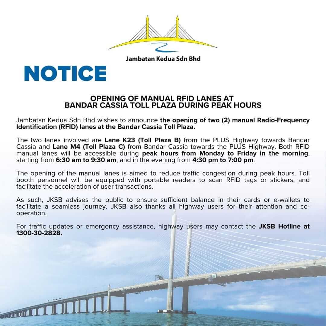 Pembukaan Lorong Manual RFID Di Plaza Tol Bandar Cassia Ketika Waktu Puncak
